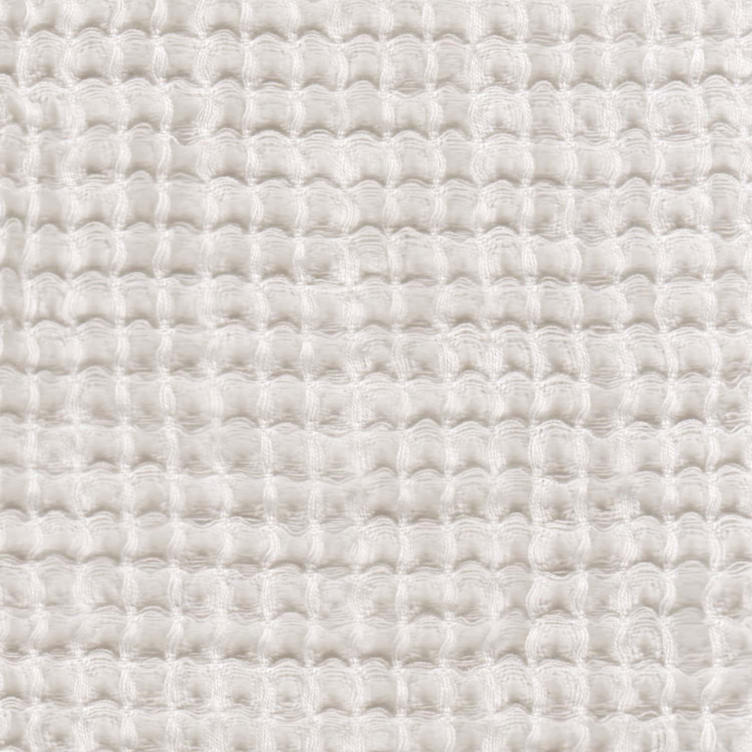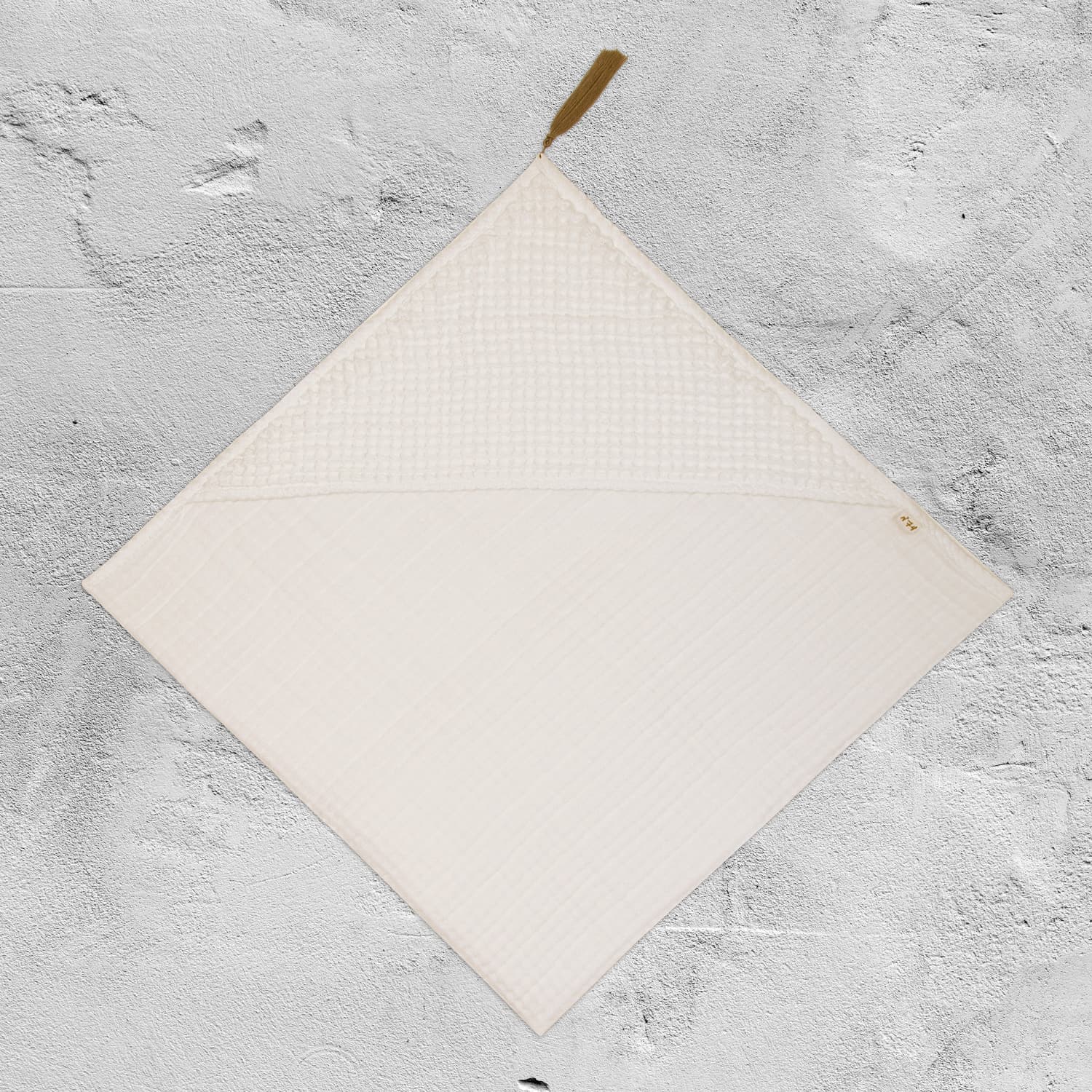 Waffle cotton wraparound bath cape with gauze lining and pom-pom hood.