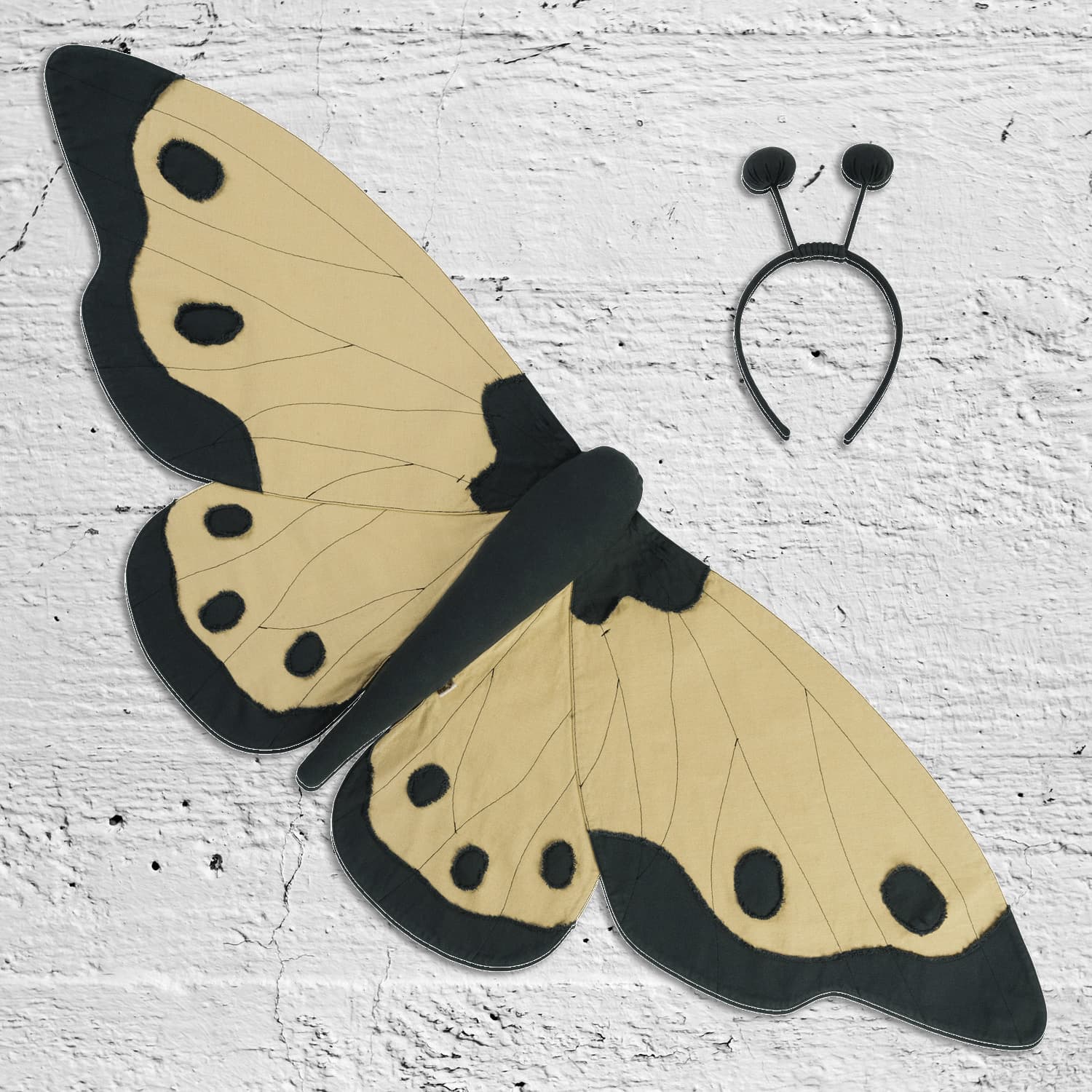 Costume made of full-span butterfly wings and antenna headband.