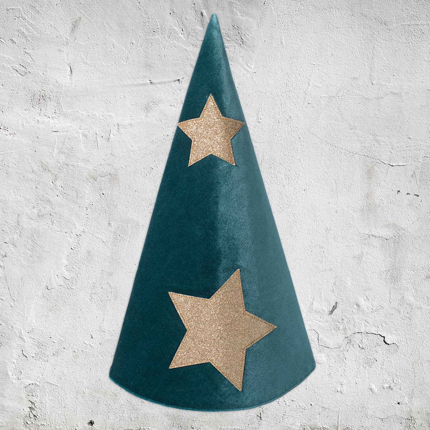 Velvet wizard hat, with glitter stars and elasticated strap.