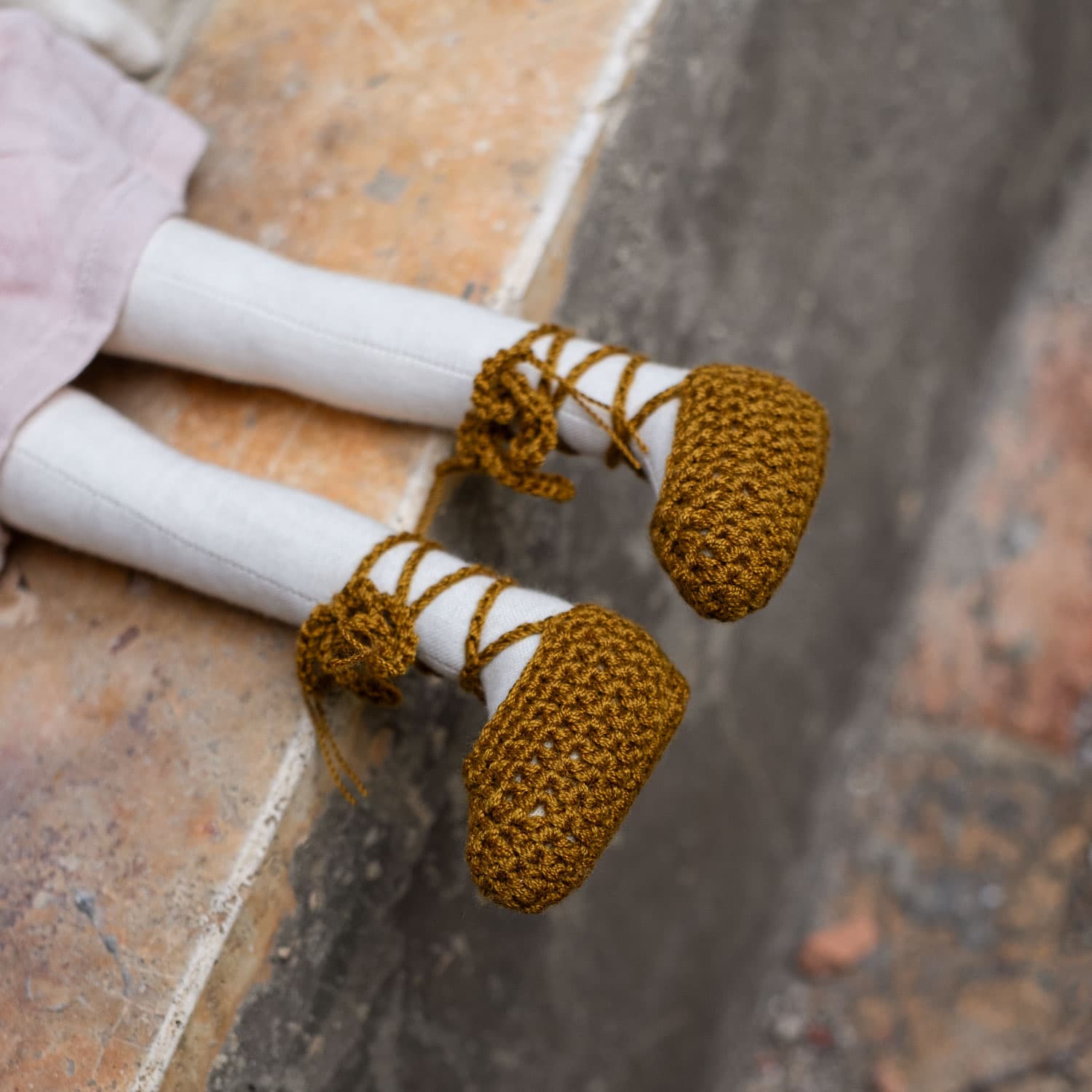 She is wearing a bloomer, a flared short skirt with elasticated waist, a tie-strap Mia top and hand-crocheted ankle-tie shoes.