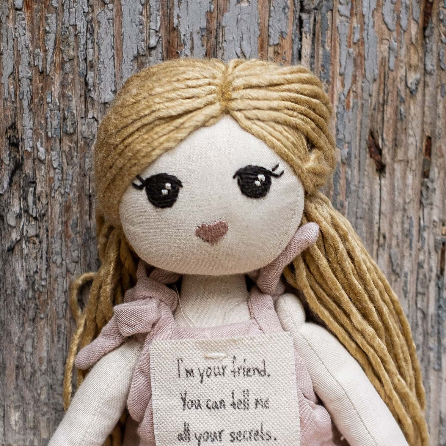 Stella Girl fabric doll. Small range. Embroidered face details and heart, hair made of a silk/merino wool mix.