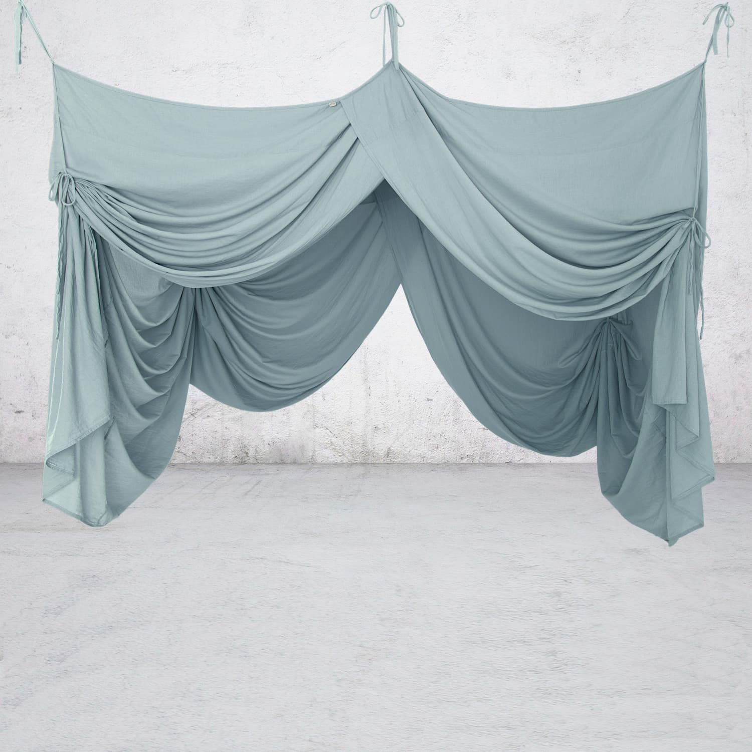 Canopy bed drape, for double beds, with four openings. 8-point hanging system with ties. Drape opening system with ties.