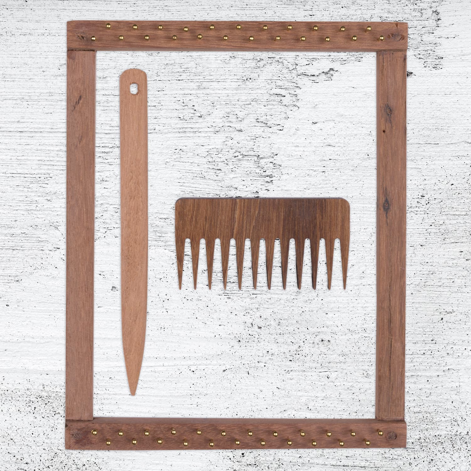 Wooden accessories included: one needle, one shuttle and one comb.