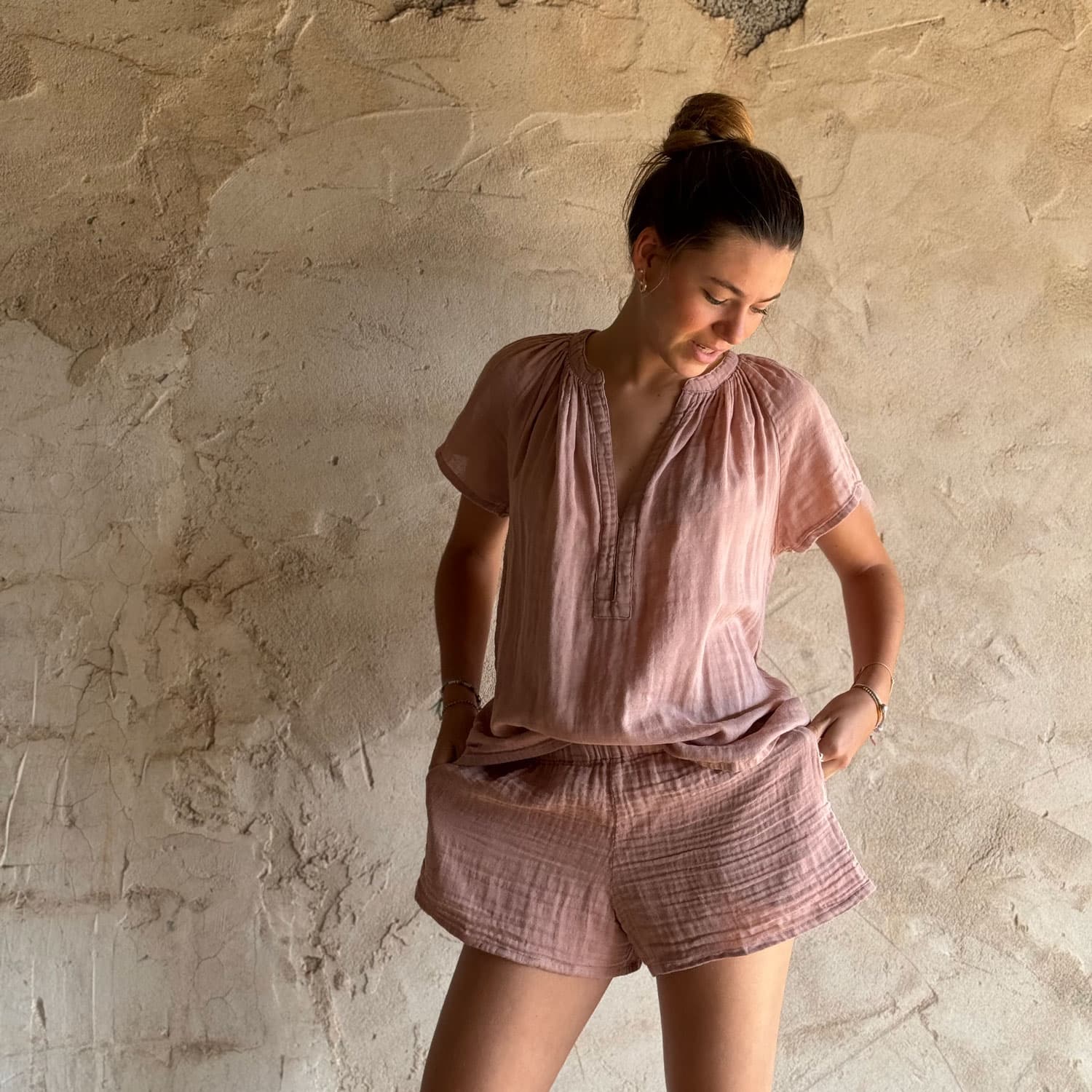 Short-sleeve top with V neck & 2 small hooks to adjust the neckline.