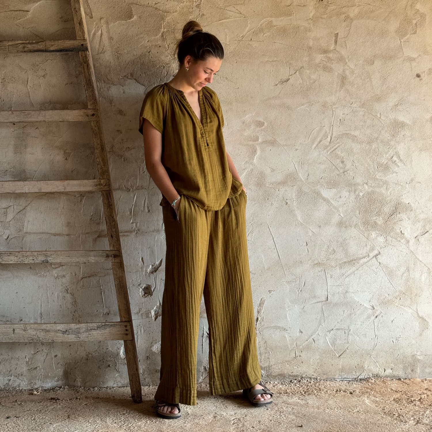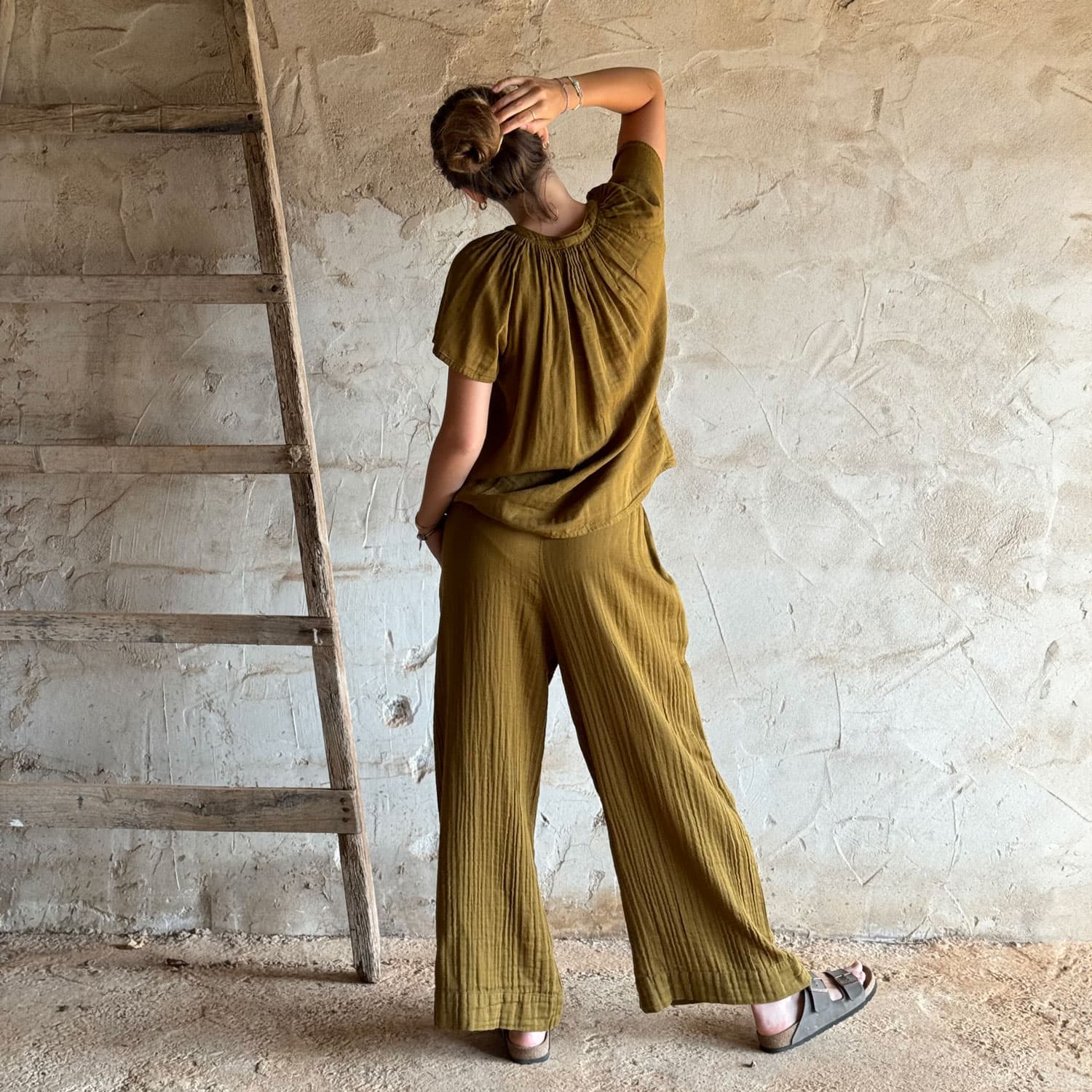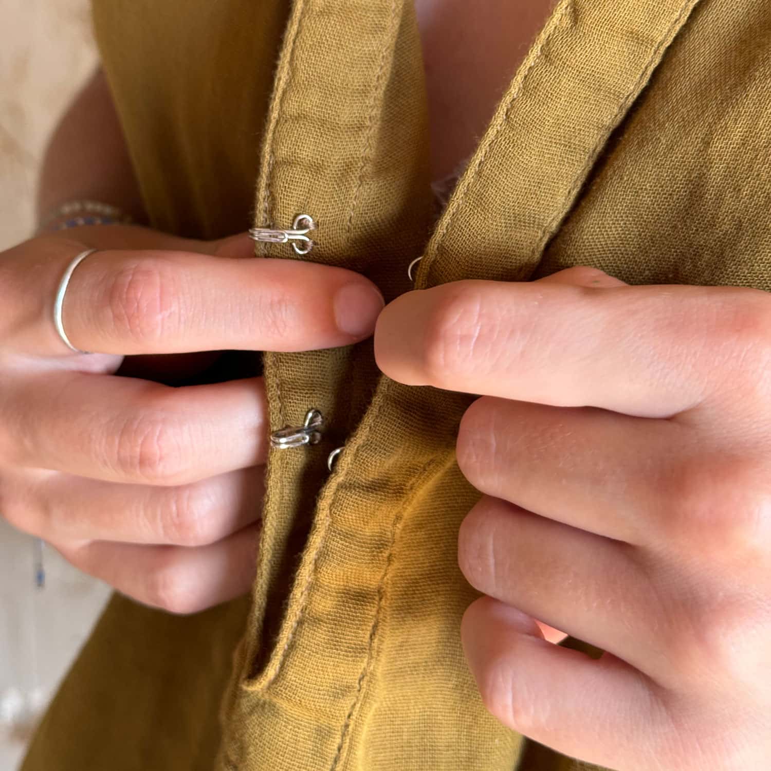 Short-sleeve top with V neck & 2 small hooks to adjust the neckline.