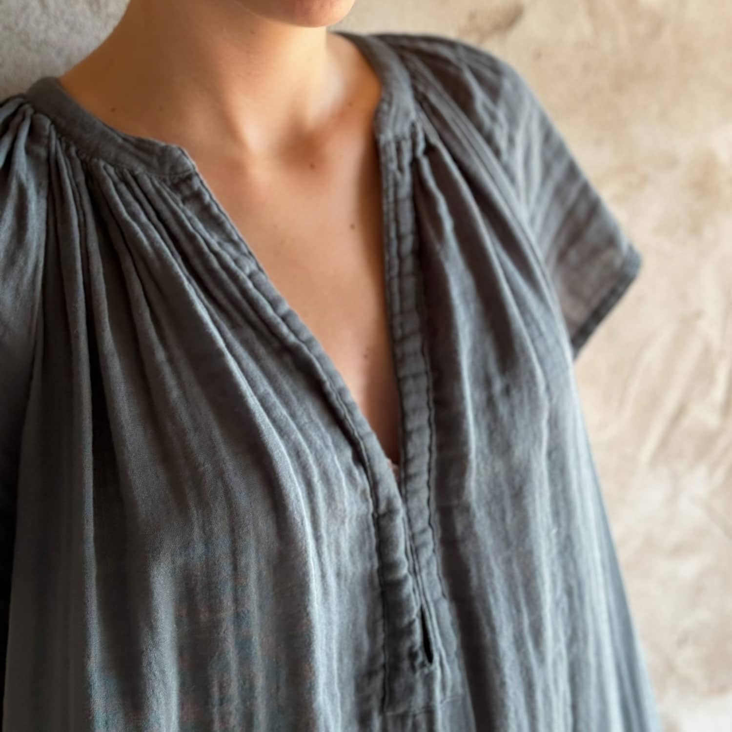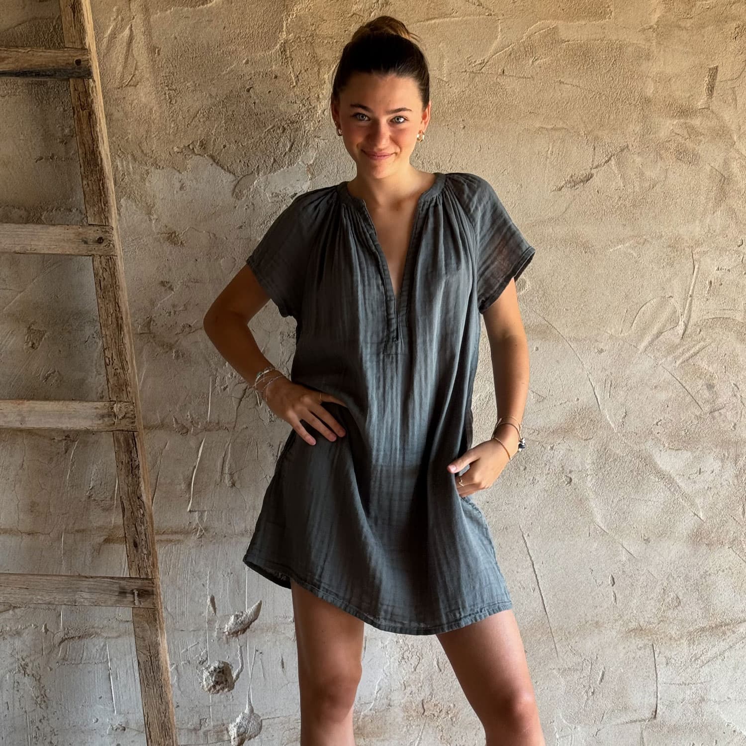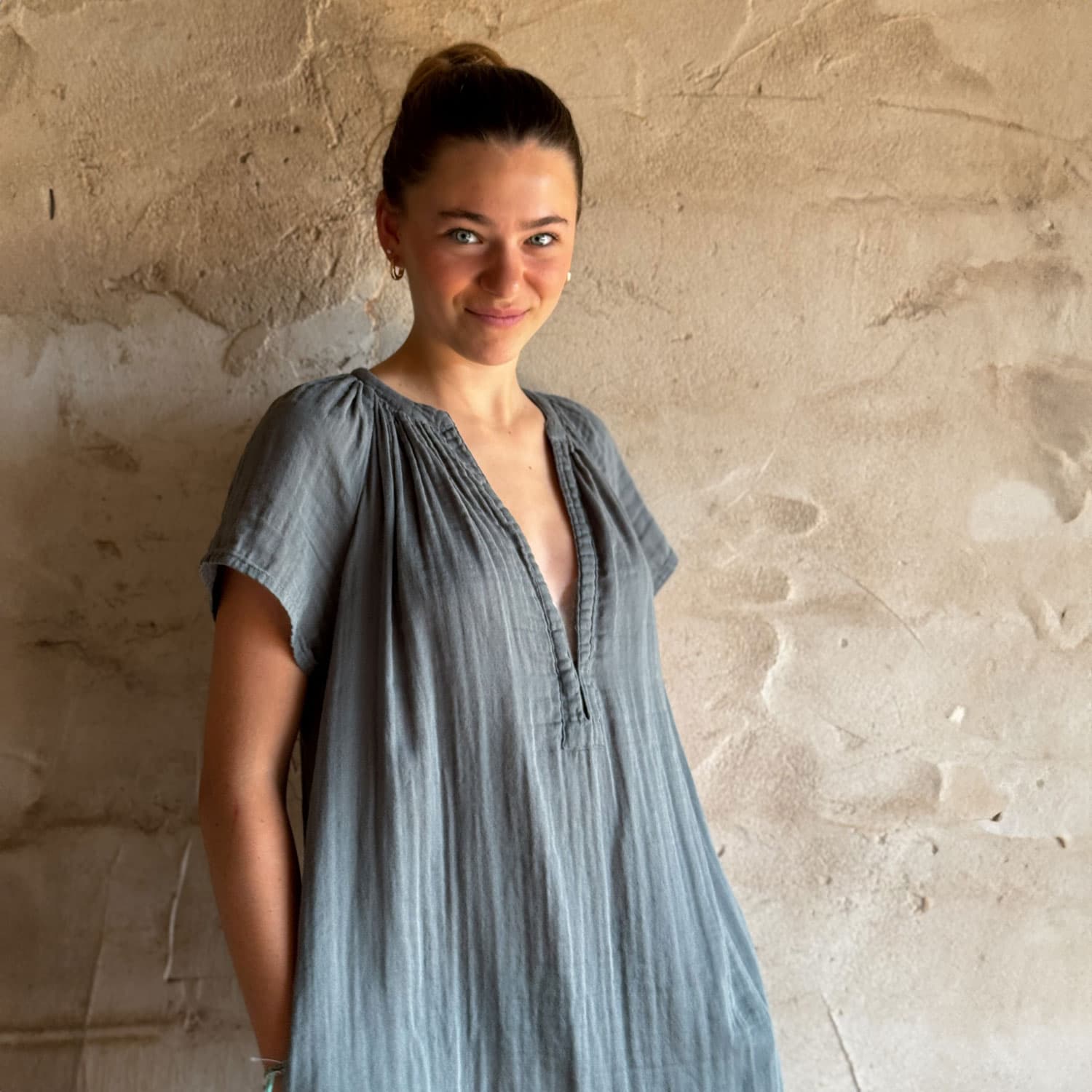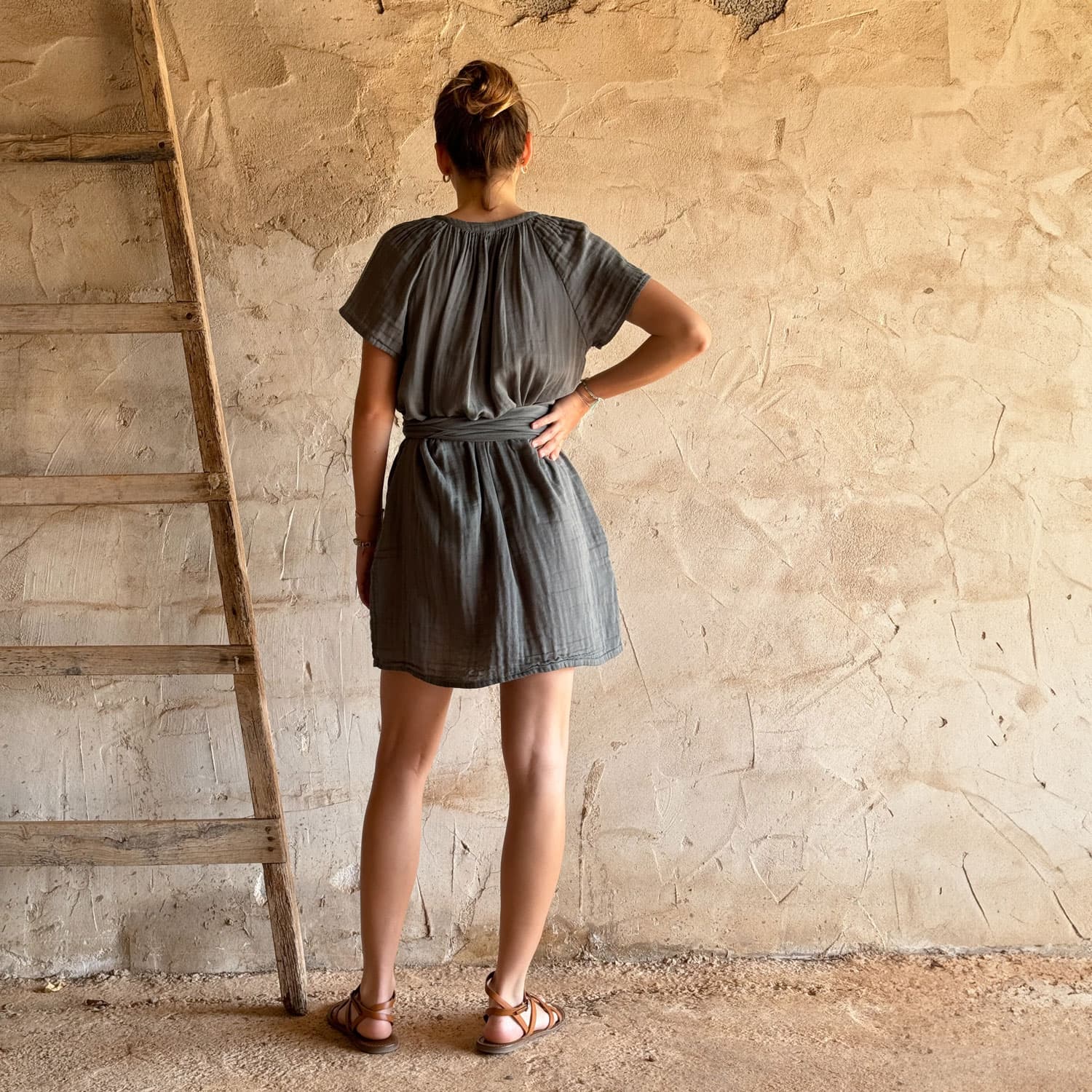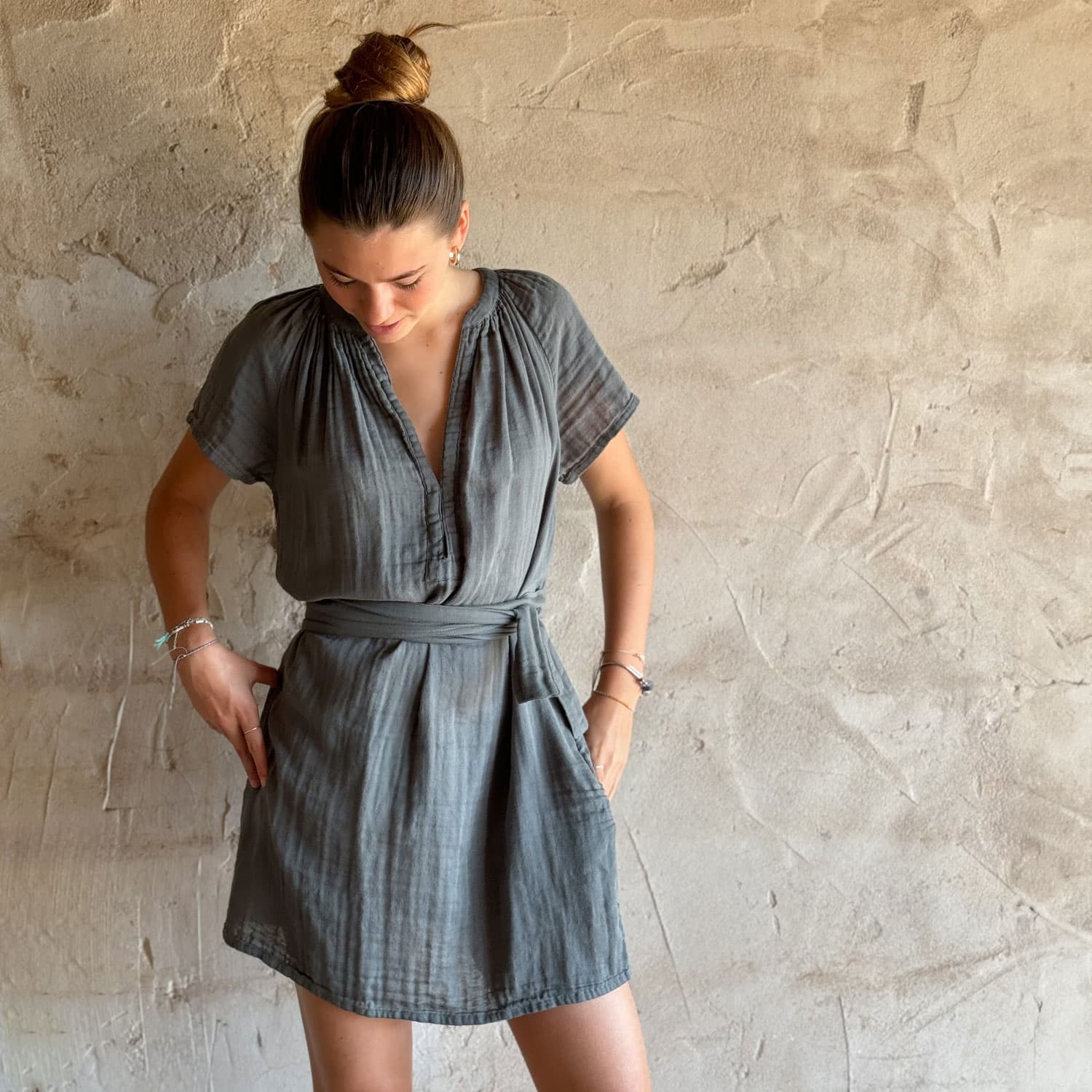 Mid-length short-sleeve dress. Pockets. 2 small hooks to adjust the neckline. Belt.