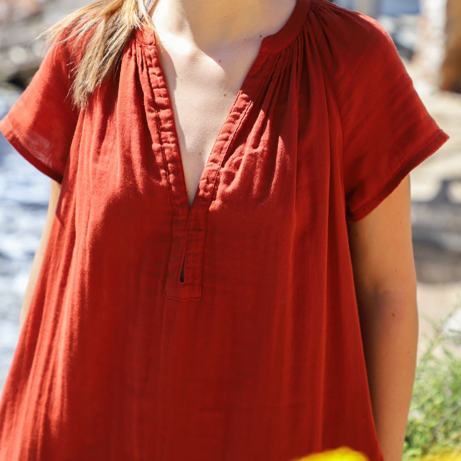Mid-length short-sleeve dress. Pockets. 2 small hooks to adjust the neckline. Belt.