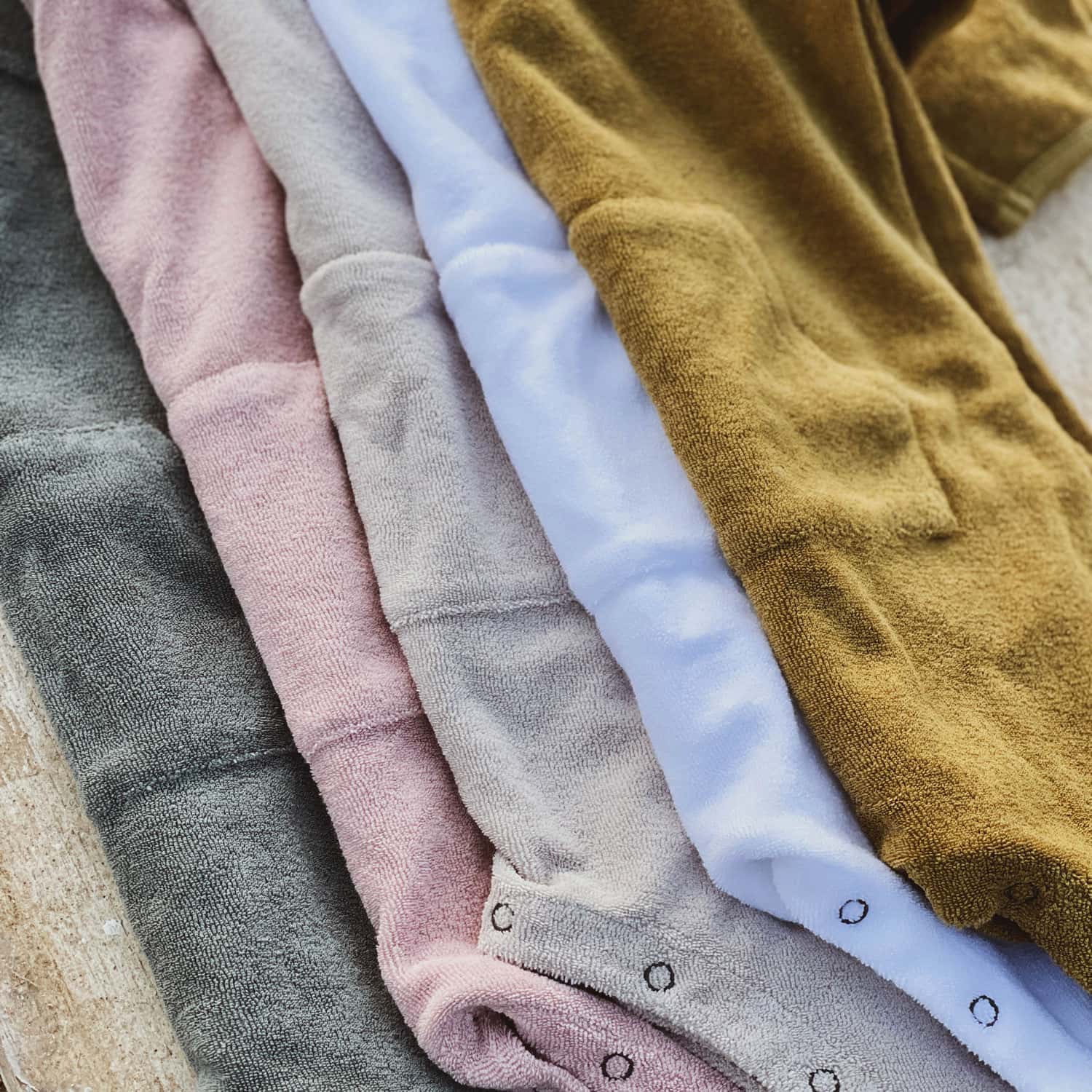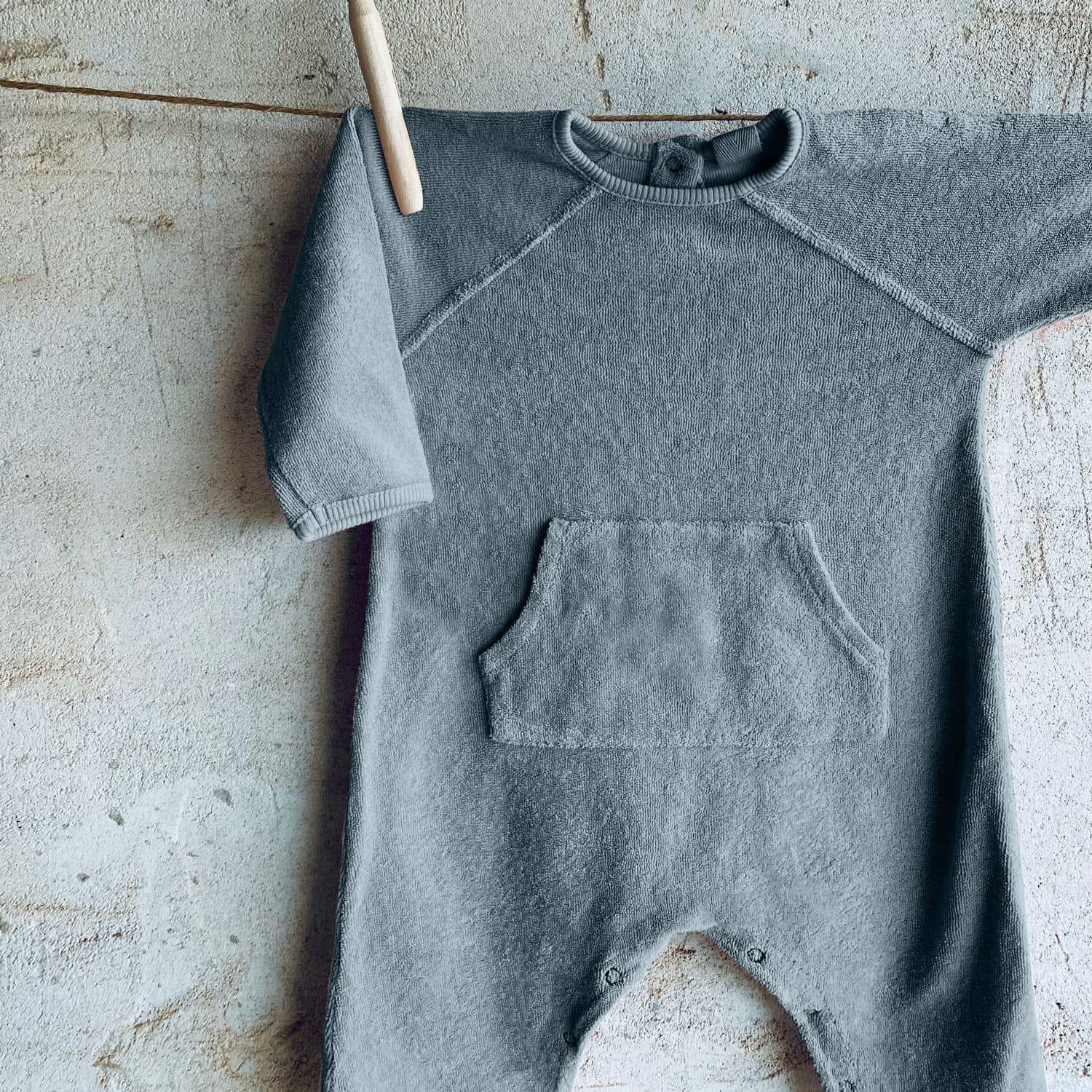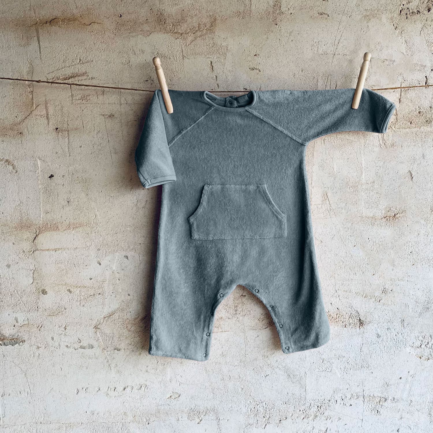 Long sleeve jumpsuit made of soft organic cotton sponge, with a kangaroo pocket, snap button on the back neckline and crotch opening with hidden snap fasteners.