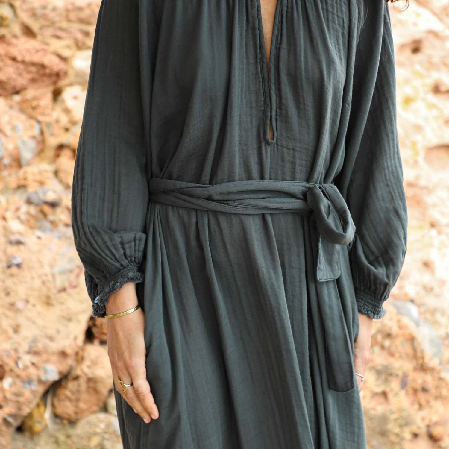 Oversized long sleeves dress. Smocked neckline with mother-of-pearl button. Belt. One small hook to adjust the neckline.