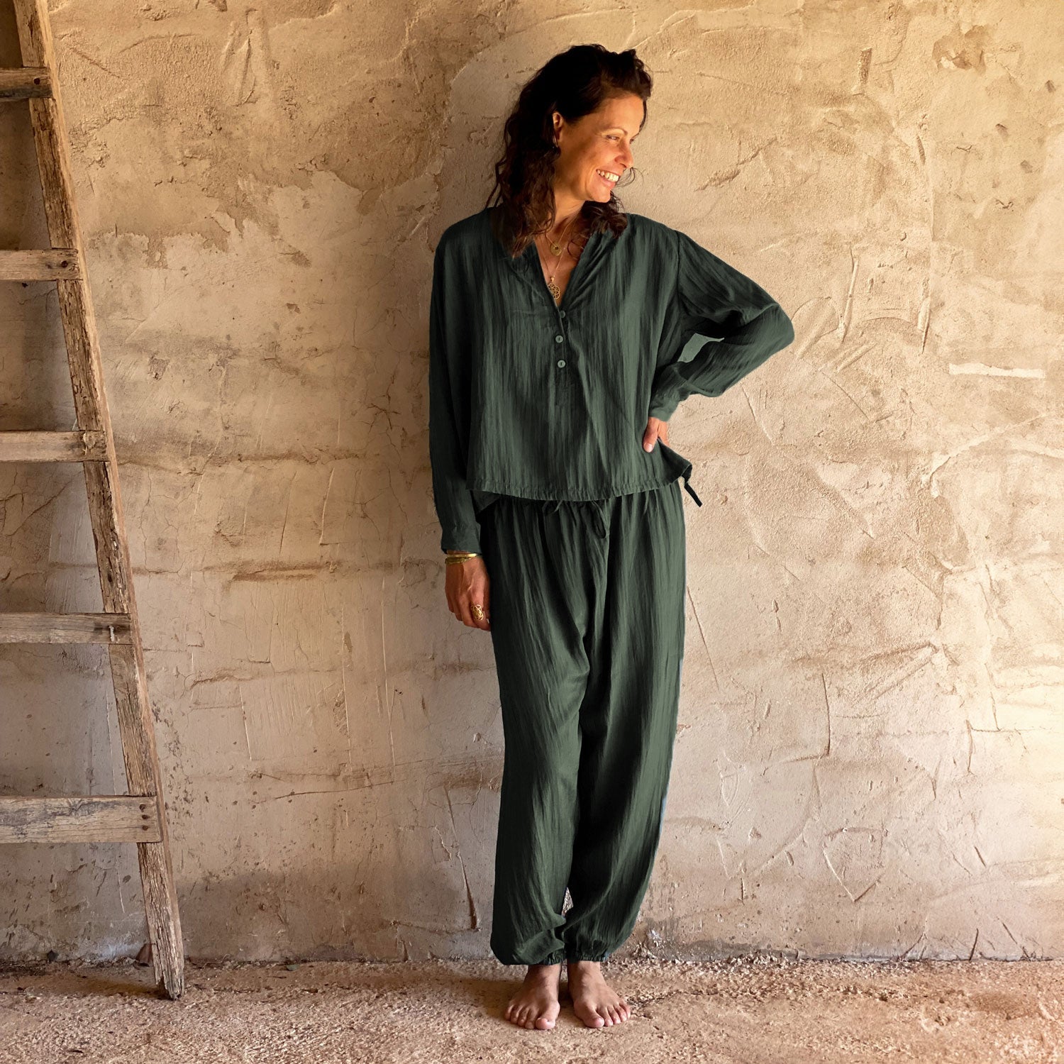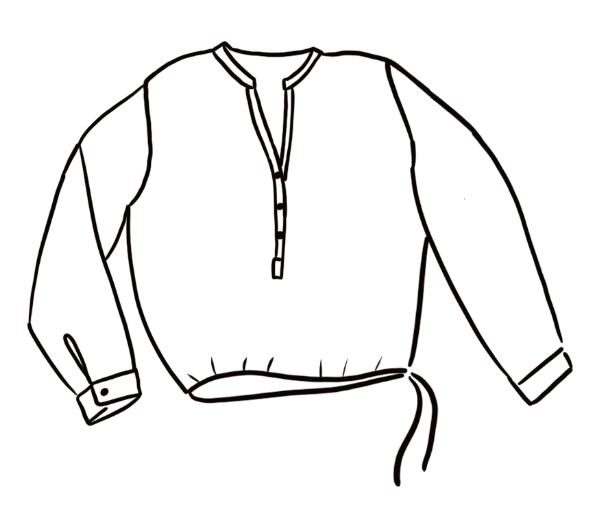 Long sleeve blouse. Front opening with mother-of-pearl buttons. Adjustable sliding tie-belt.