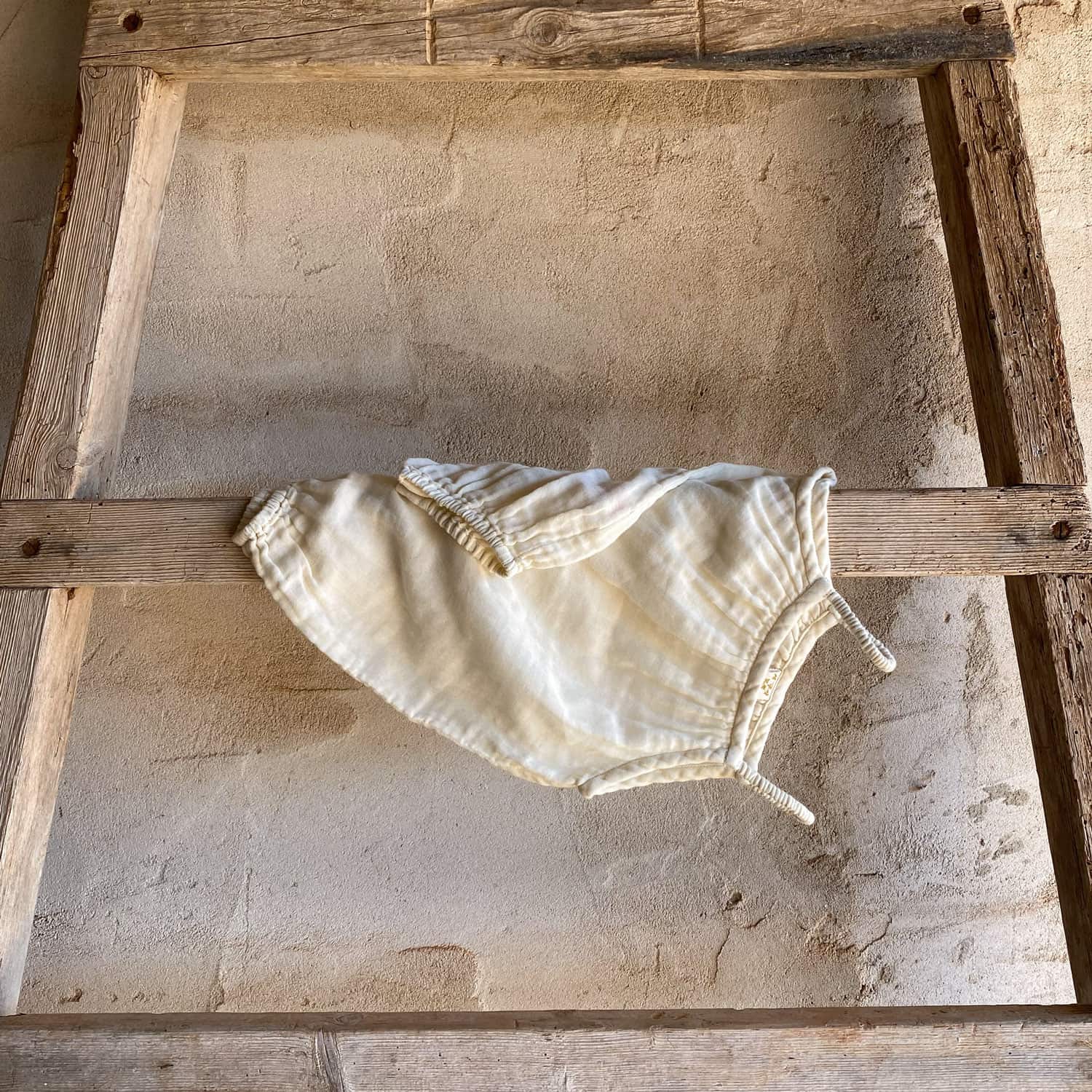 Baby romper with elasticated straps. Crotch opening with hidden snap fasteners.