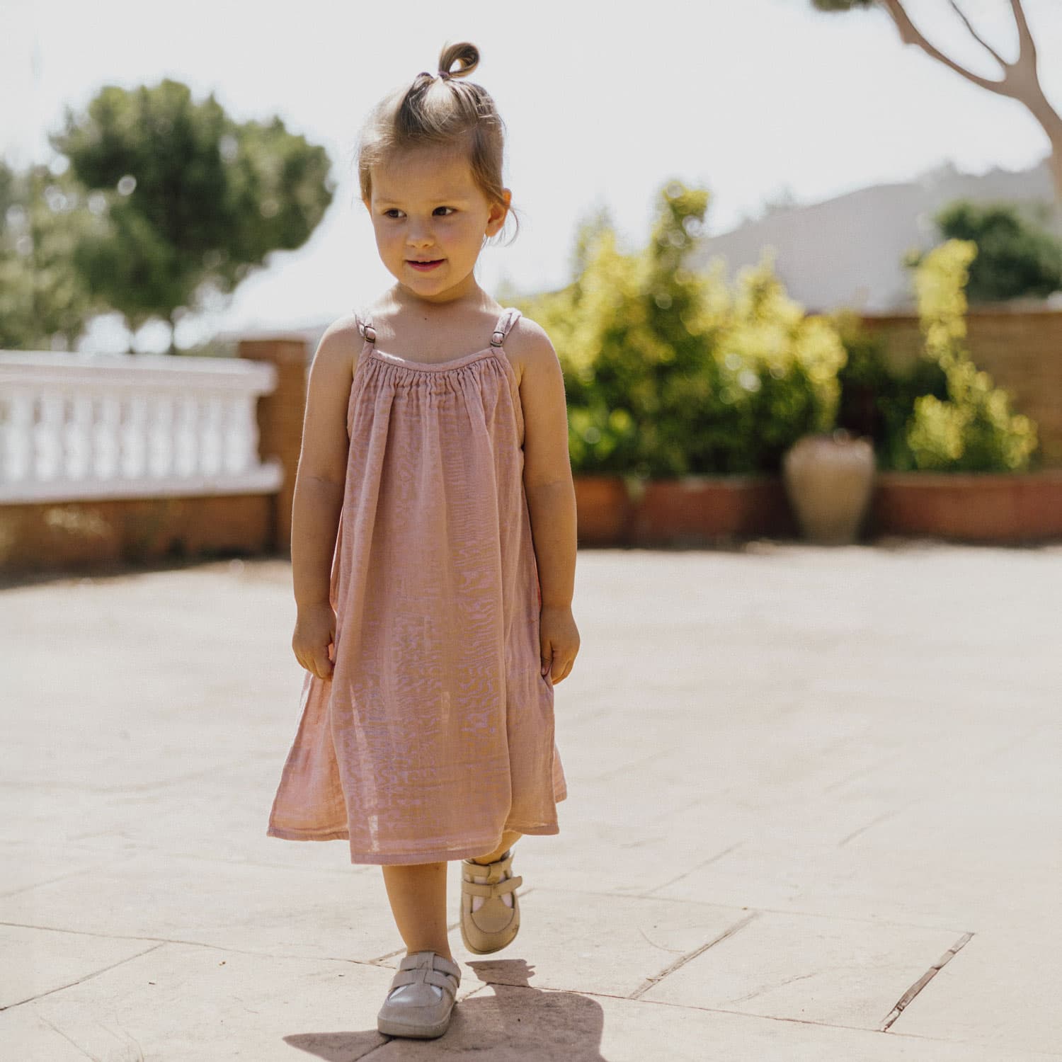 Short flared dress. Shoulder straps adjustable at the back with small metal rings.
