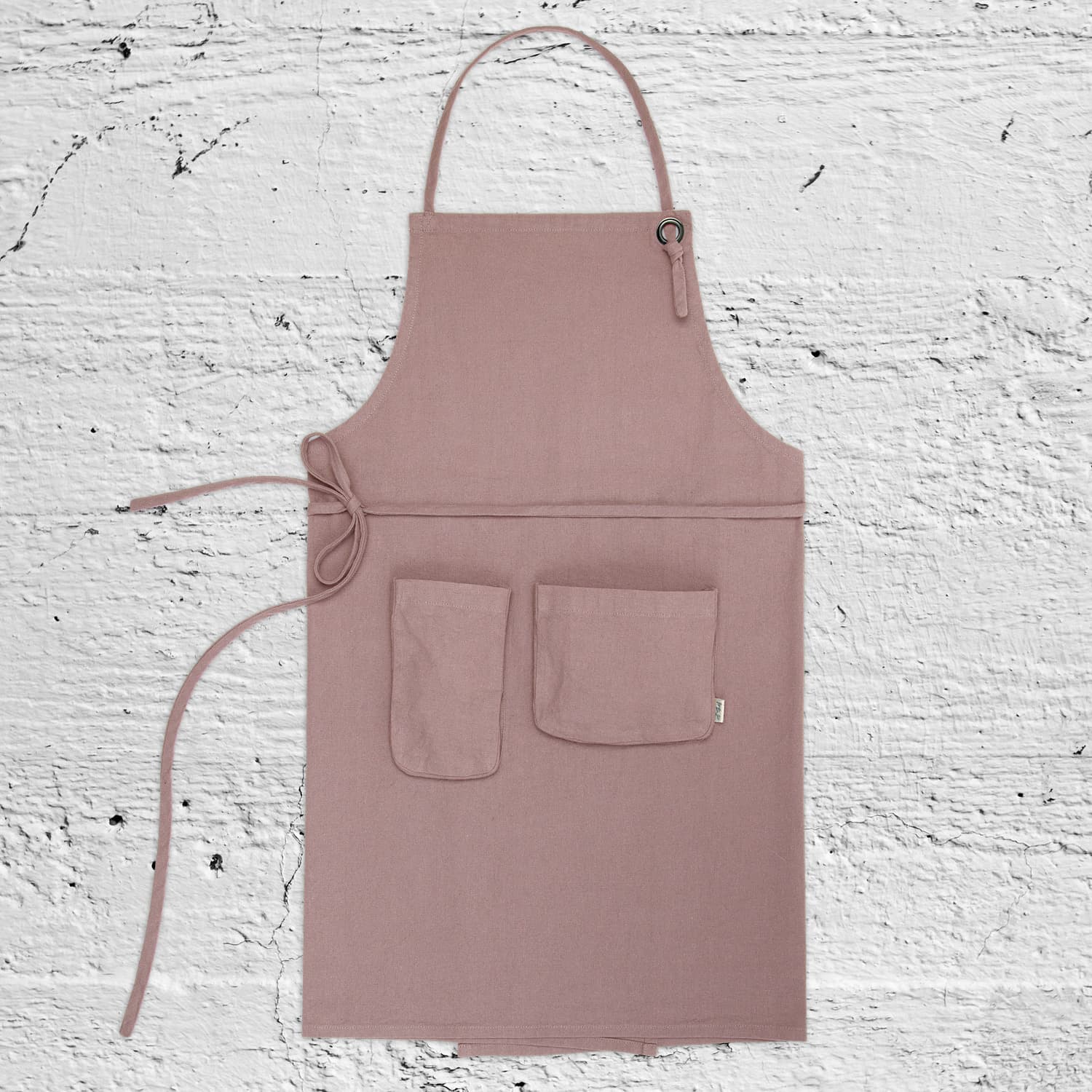 Apron, adult size, made of soft and resistant cotton fabric. Two large bellow pockets on the front. Adjustable neck and waist tie straps.
