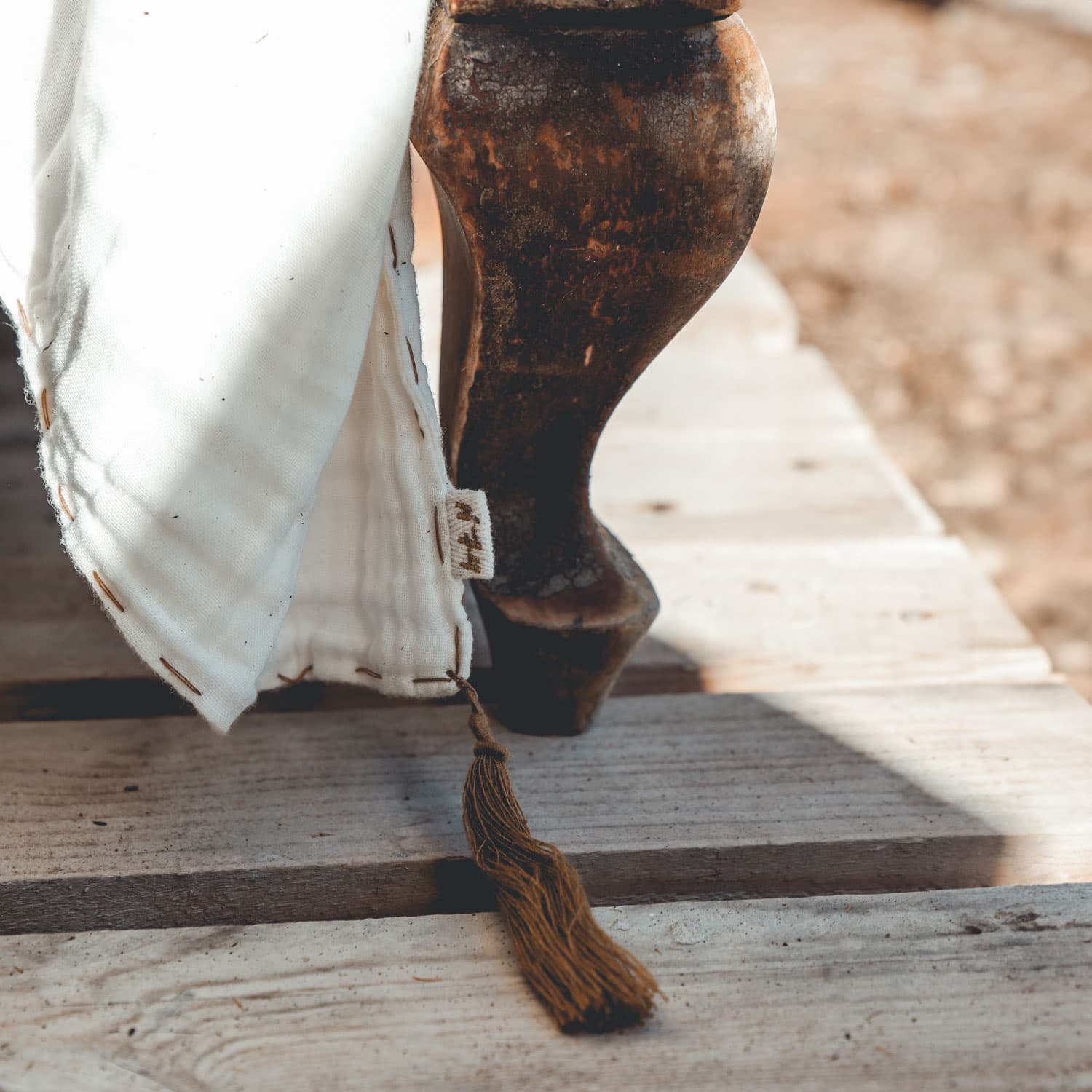 Light blanket with hand-embroidered cross details and hem, and pom-pom.