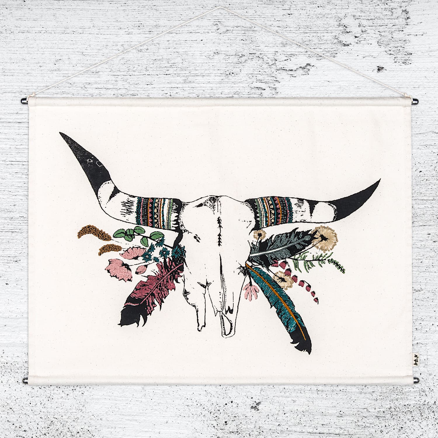 Poster/wall decoration made of hand-embroidered cotton canvas, with buffalo pattern.
