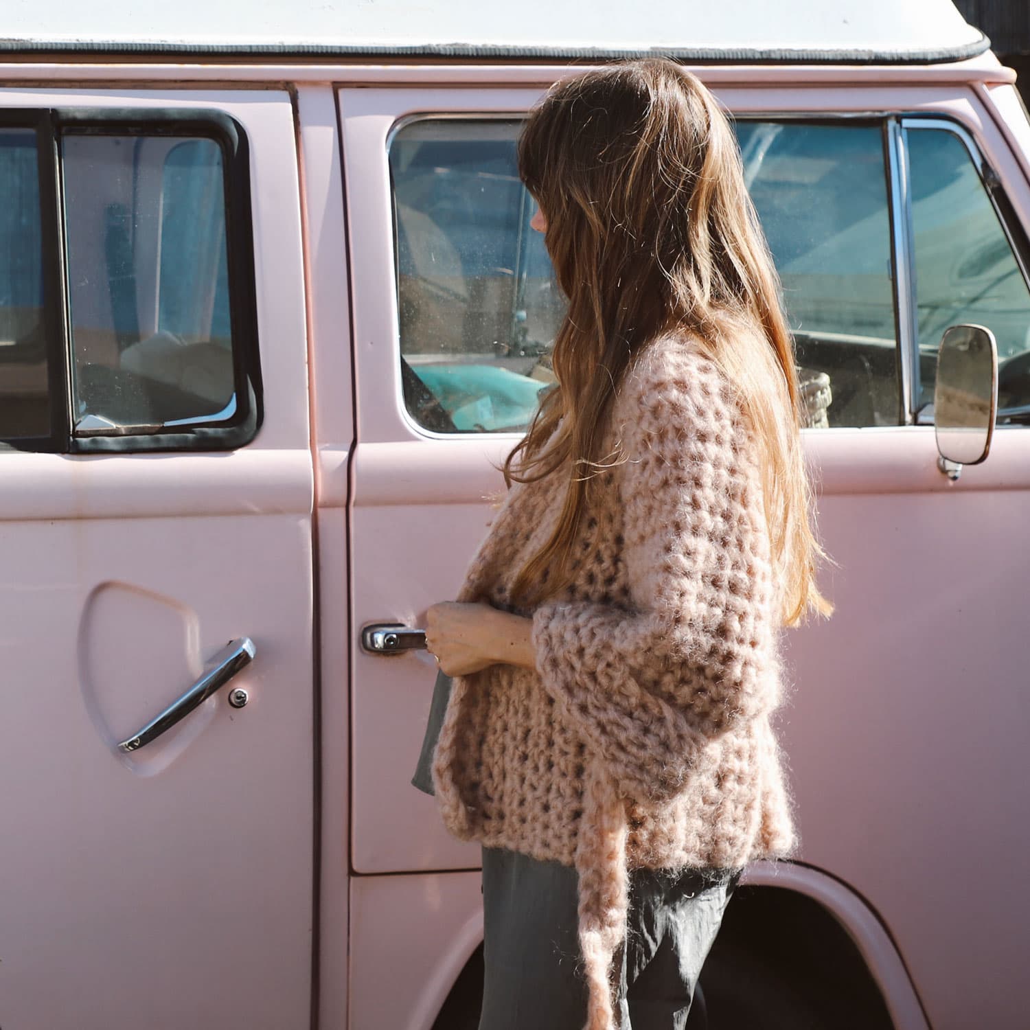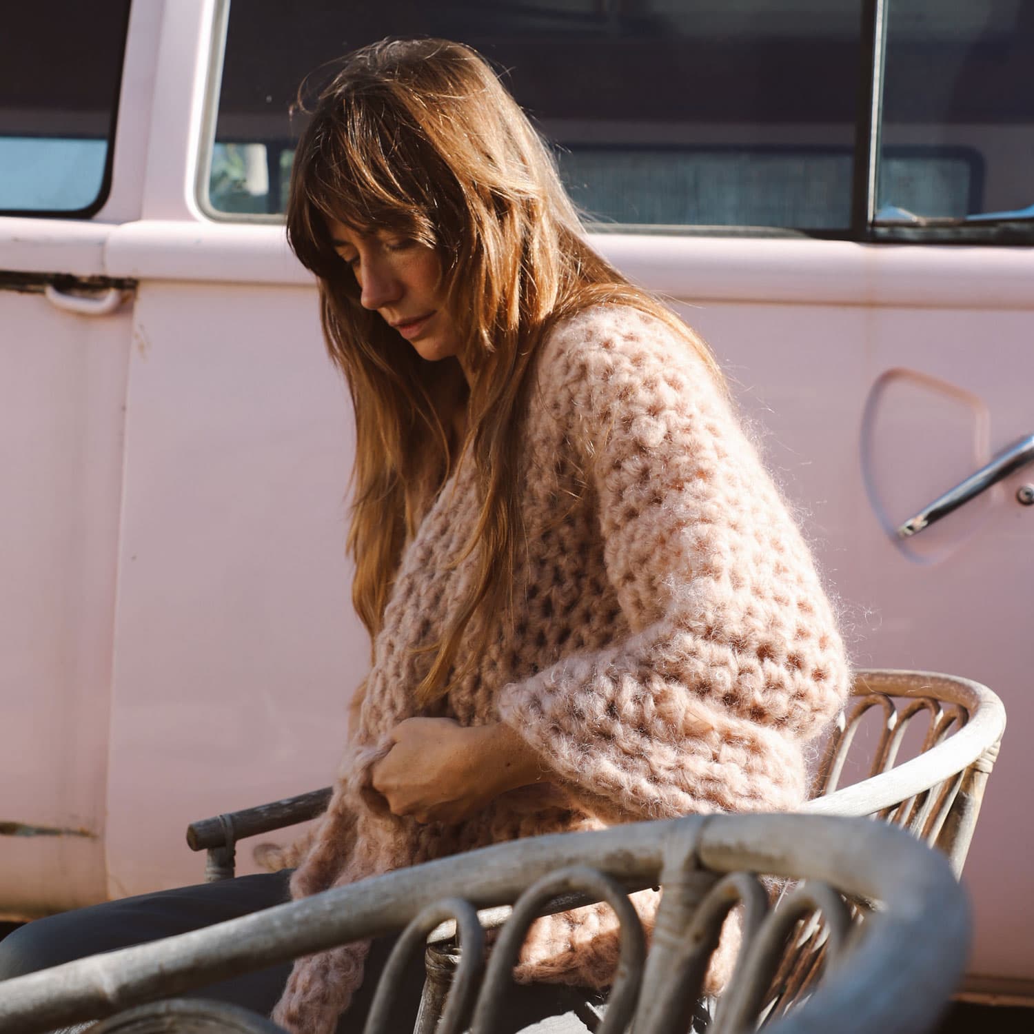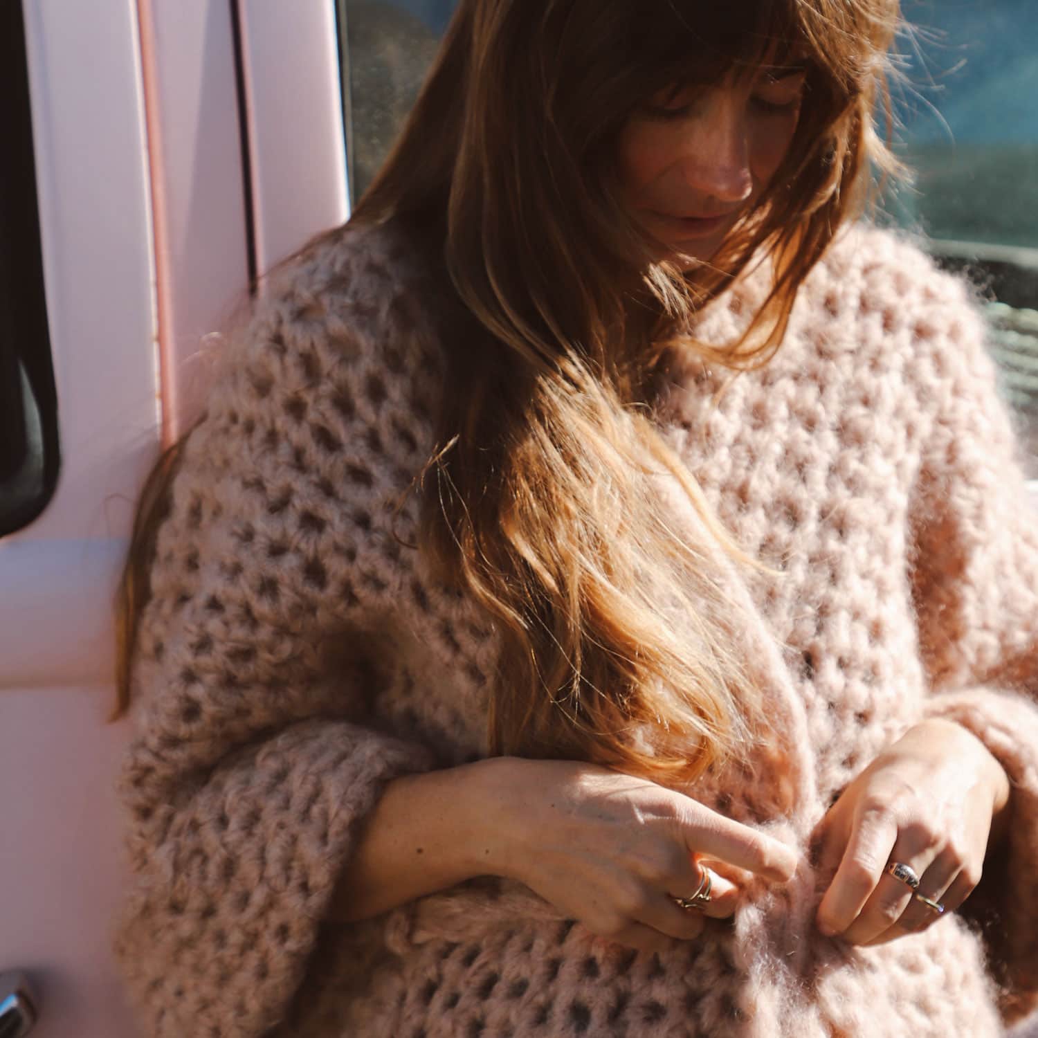 Mohair Wool Kimono-style cardigan with wide long sleeves and belt, hand-crocheted at home by artisans in Ibiza.