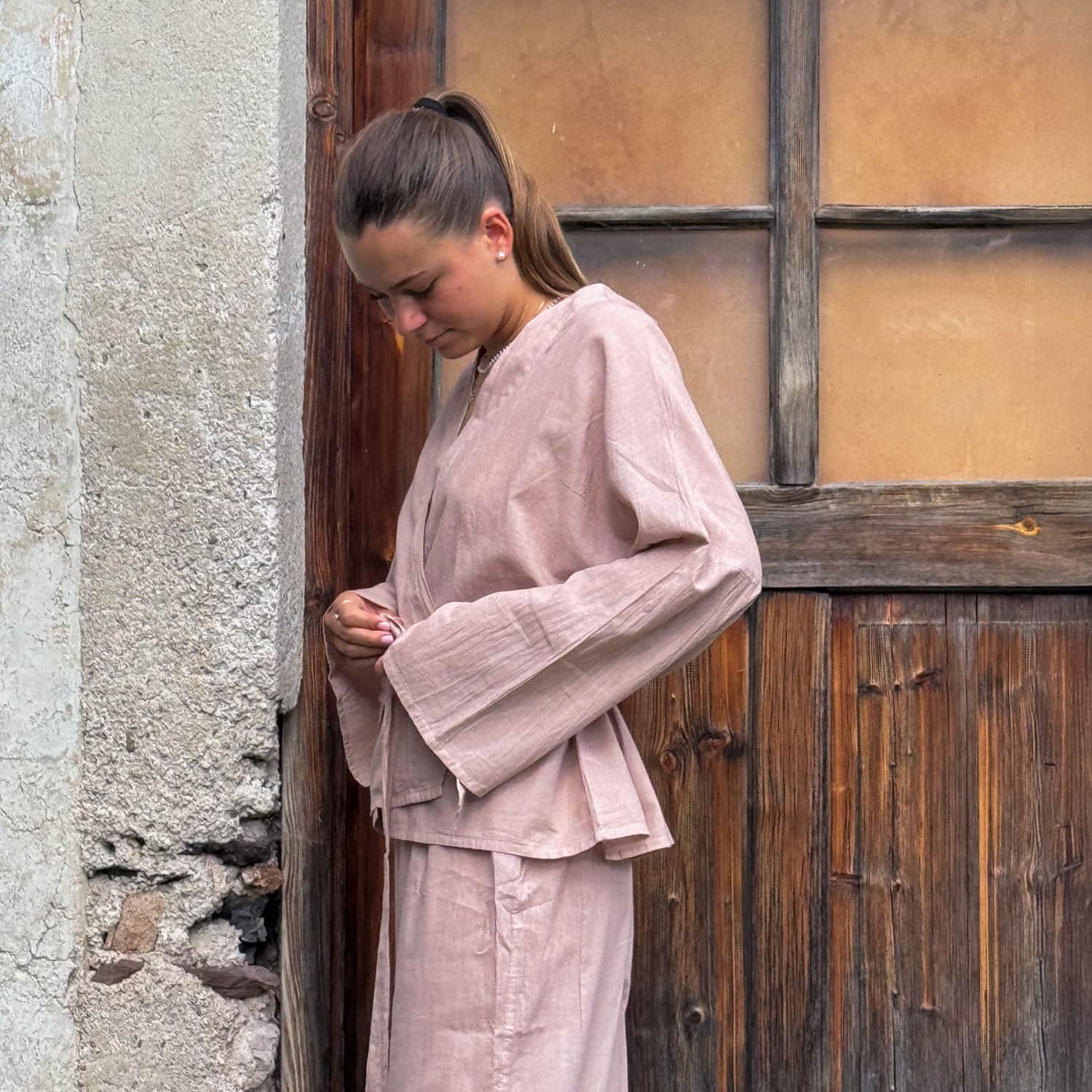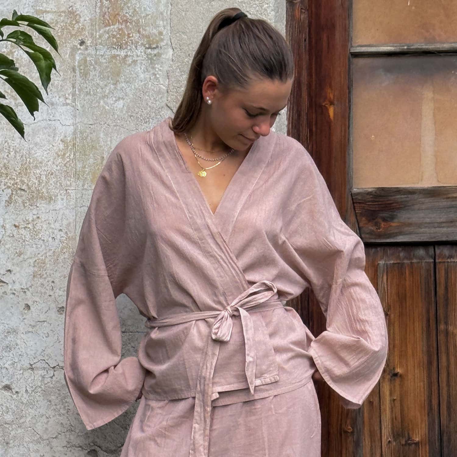 Kimono jacket with wide three-quarter sleeves and outer tie belt.